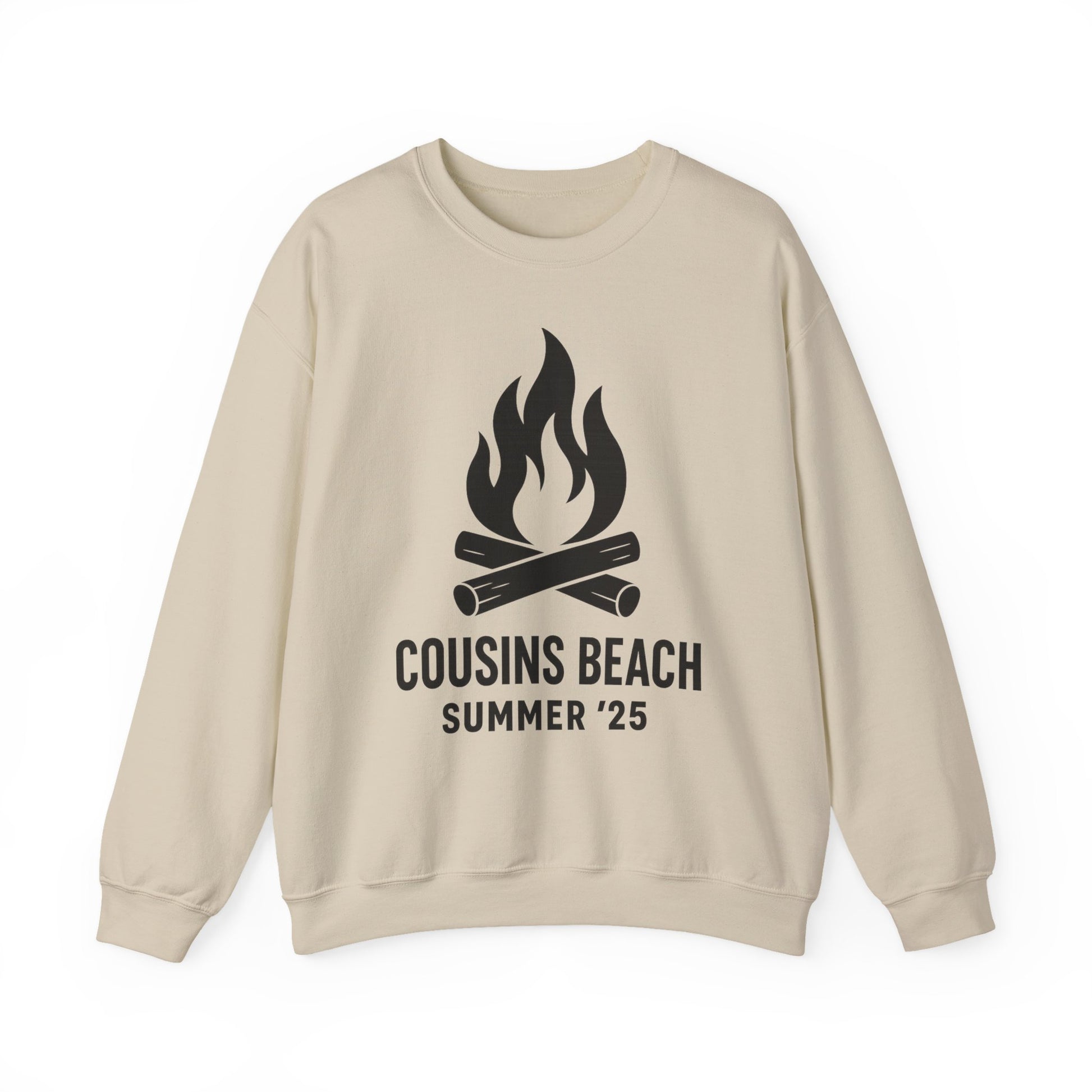 A nostalgic sweatshirt featuring a minimalist design of a bonfire silhouette with glowing flames and 'Cousins Beach, Summer '25' text. Perfect for fans of beach life, summer adventures, and cozy nighttime vibes. Ideal for adults who enjoy summer nights by the fire with friends.