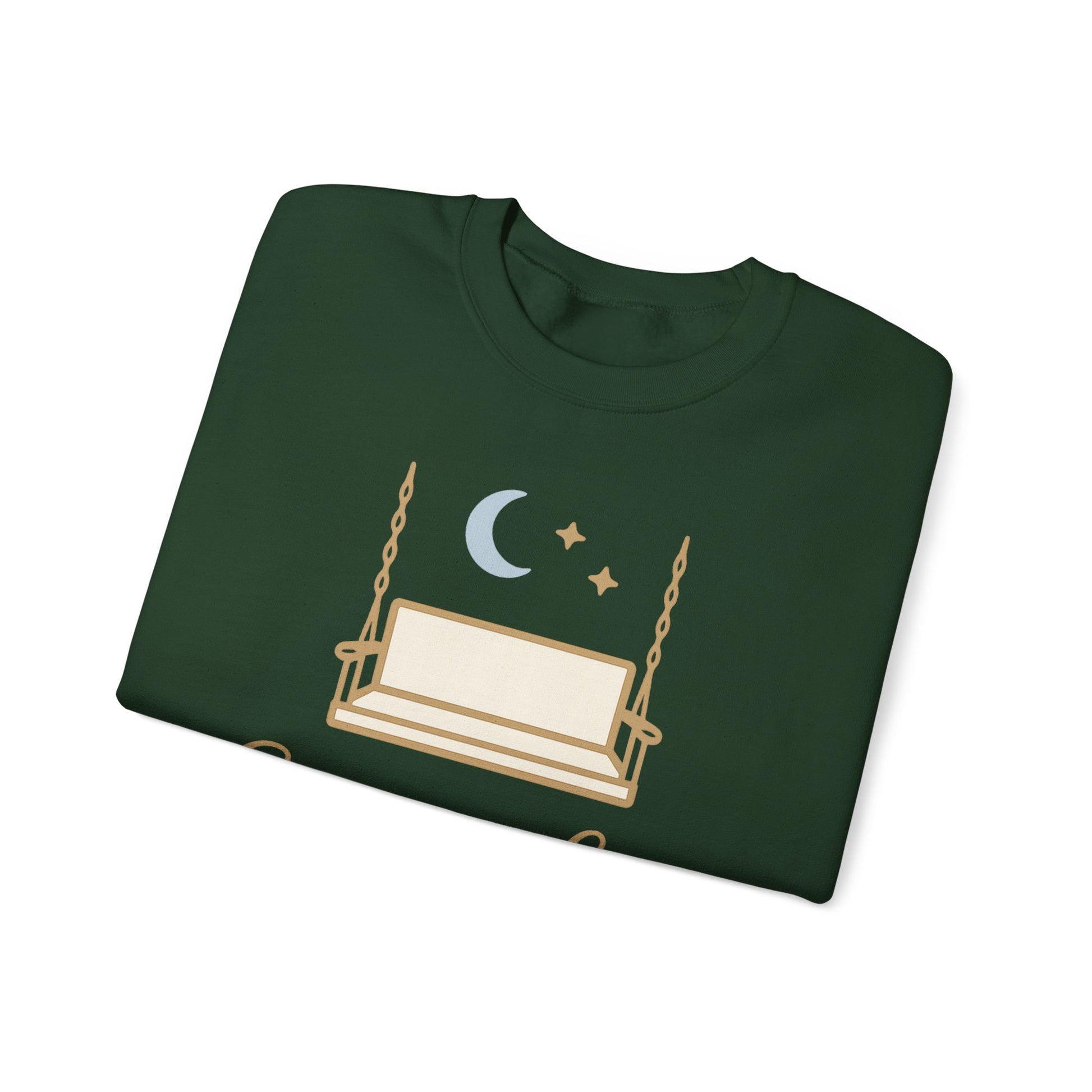 A dreamy heavy blend crewneck sweatshirt featuring a minimalist porch swing illustration with a crescent moon and stars above. The design includes the phrase “Summer Love Lives Here” in soft romantic script, styled with gentle pastel tones. Perfect for fans of cozy, romantic vibes and nostalgic summer memories. Ideal for adults looking for a comfy and stylish sweatshirt for colder months, with top-tier durability and ethical production.